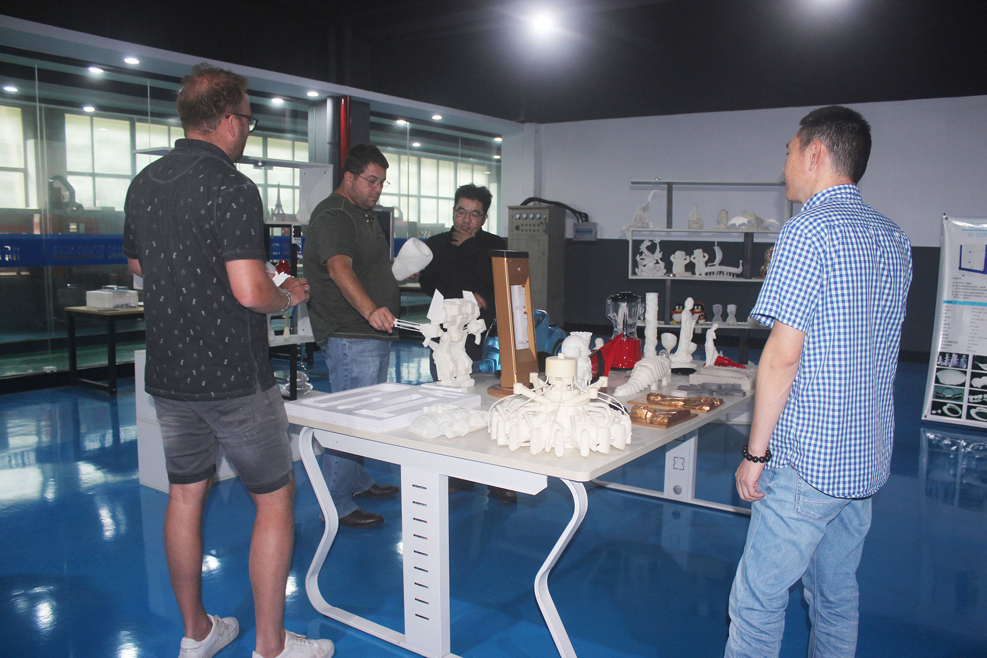隨后,荷蘭客戶在陶總的陪同下參觀了3D打印車間、樣品間、CNC精雕車間,詳細了解了3D打印的工作原理,包括SLA工業級、FDM桌面級。荷蘭客戶代表Dennis表示:工作的3D打印機讓他意識到傳統制造業與3D打印技術的結合正在碰撞出新的科技火花,并希望在這個領域與浙創科技有進一步的交流與合作。在參觀中,Dennis表示對于他們公司來說,借助3D打印技術能更好的優化產業結構,助力企業可持續發展。同時,荷蘭客戶對浙創科技自行研發的光敏樹脂進行了高度的評價。